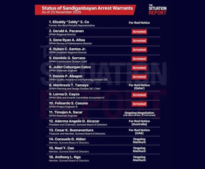 SA 16 na pakay ng warrant of arrest na inilabas ng Sandiganbayan kaugnay ng flood control scandal, apat ang nakapuslit na patungo sa ibang bansa.