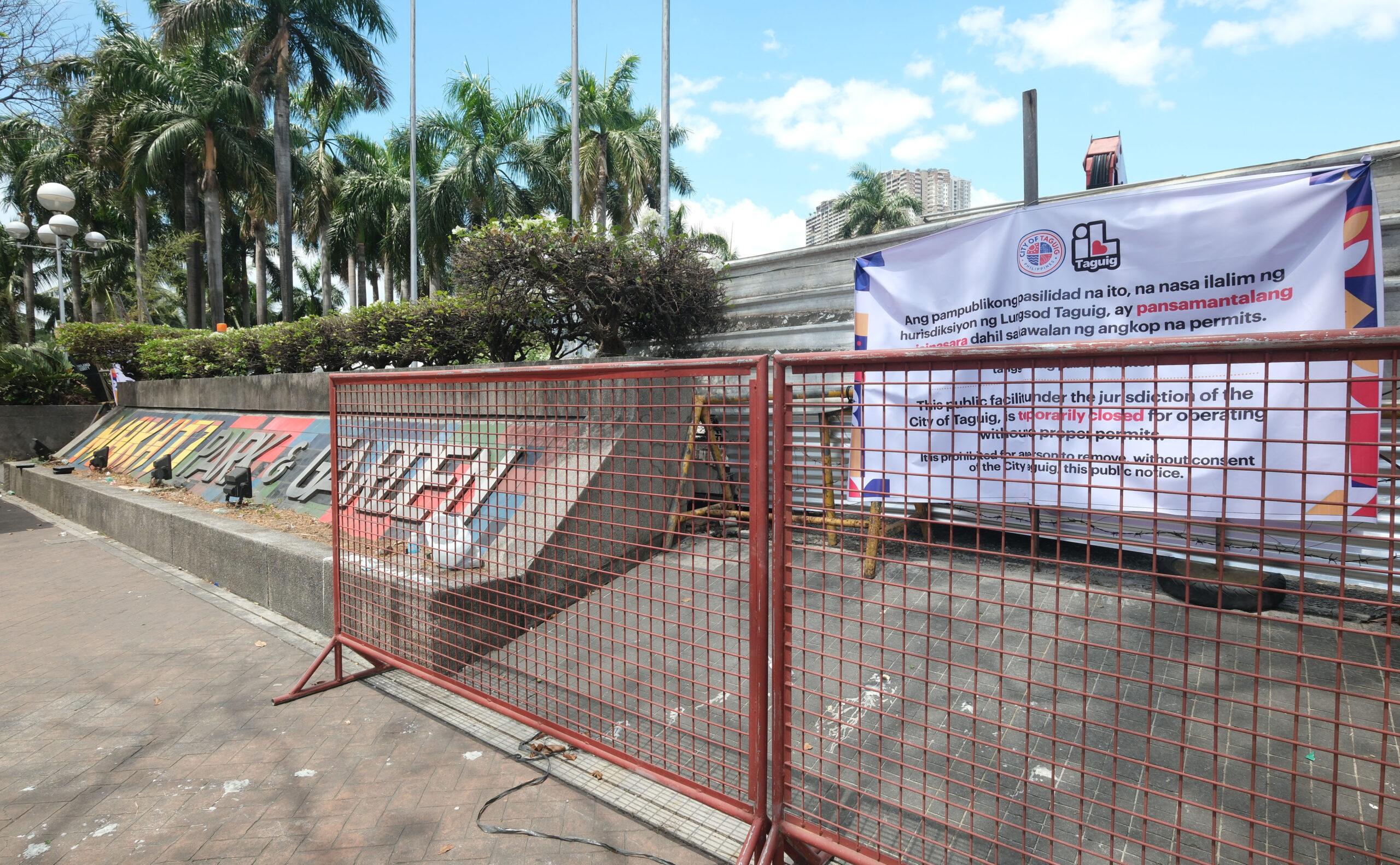 Sa ipinaskil na karatula sa entrada ng Makati Park, iginiit ng lokal na pamahalaan ng Taguig na ipinasara ang naturang pasilidad dahil sa kawalan ng permit. Hindi na rin umano nagagamit ang parke na di umano’y ginawang garahe at imbakan ng mga heavy equipment at iba pang kagamitan ng Makati city government.